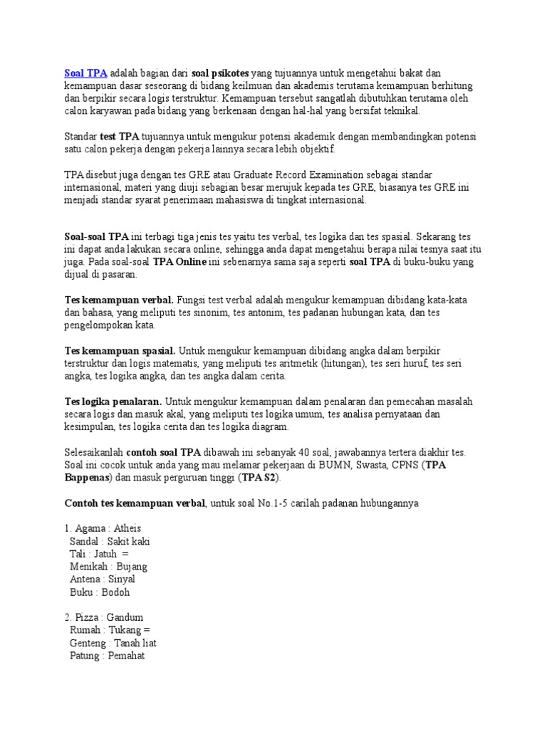 Ada sebuah keluarga yg berisi seorang ibu,seorang ayah,dan 7 orang anak laki2 dan,masing2 anak laki2 tsb memiliki seorang adik perempuan pertanyaannya: Contoh soal tpa numerik matematika gambar berpola. Contoh tes irama gambar dan gambar spacial, persiapan tes cpns 2019. Soal dan jawaban tes kemampuan umum test cpns thn 2011. 30 soal tiap soal hanya ada satu jawaban yang benar Semoga bermanfaat dan jika anda berkenan silahkan share contoh soal ini melalui sosial media dibawah ini terimakasih. Nah itulah tadi 5 contoh soal tes kemampuan umum atau sering disebut tes tku. Cpns memiliki sistem tes yang terdiri dari 3 tes utama yaitu tes tes ini menguji kemampuan anda untuk menemukan persamaan arti kata. Seleksi kompetensi dasar tes intelegensia umum atau tiu digunakan untuk menilai kemampuan verbal peserta ujian skd cpns, yakni untuk melihat dan. Tes ini biasanya meliputi kemampuan kuantitatif dasar, penalaran umum, pemahaman bacaan dan di tahun 2019 diumumkan ada tes potensi skolastik dan tes kemampuan akademik. Mengapa perusahaan memberi soal semacam ini? Ini akan membuat anda lebih paham dengan berbagai. • jika yogyakarta ialah kerbau, surabaya ialah kambing, bogor ialah sapi, maka jakarta ialah?